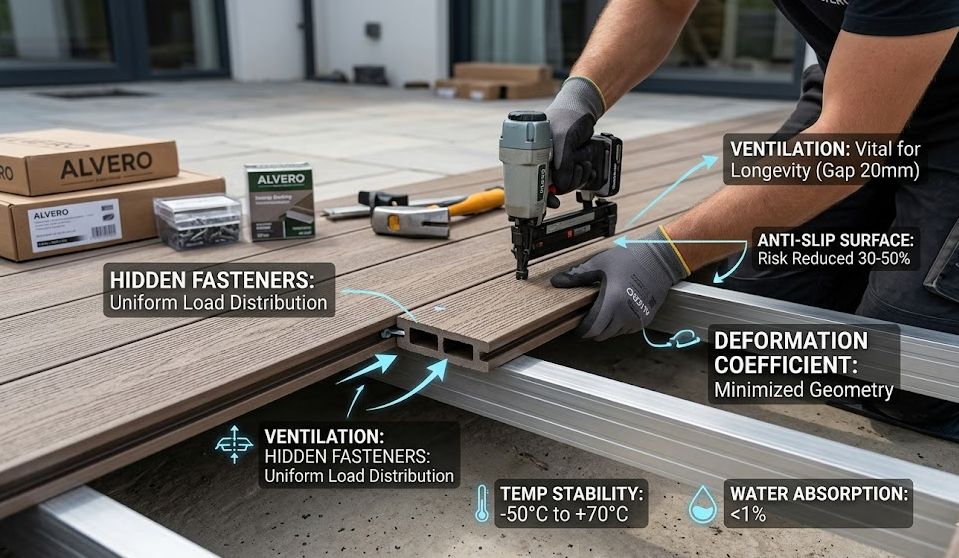 За оцінками експертів з World Green Building Council, до 40% проблем із decking-покриттями пов’язані не з матеріалом, а з неправильним монтажем. Саме тому системи кріплення, які пропонує ALVERO, мають не менше значення, ніж сама дошка.