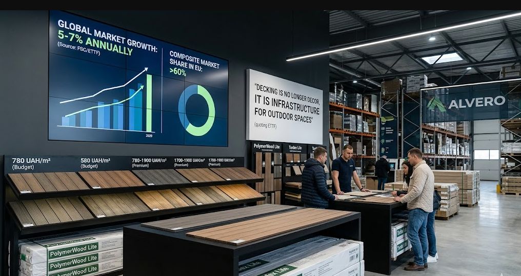 Сегмент зовнішніх підлогових покриттів за останні 10 років пережив тиху, але радикальну трансформацію, і саме терасна дошка стала тим продуктом, який фактично задає нову норму якості для відкритих просторів. За оцінками профільних аналітиків з Forest Stewardship Council (FSC) та European Timber Trade Federation (ETTF), глобальний ринок decking-рішень демонструє стабільне зростання на рівні 5–7% щорічно, а частка композитних матеріалів уже перевищує 60% у ЄС. На цьому фоні інтернет-магазин ALVERO виглядає не просто торговою точкою, а повноцінною платформою підбору матеріалів — від бюджетного сегмента до преміум-класу з чіткою структурою пропозиції, де ціни стартують від 780 грн/м² і доходять до 1700–1900 грн/м².
